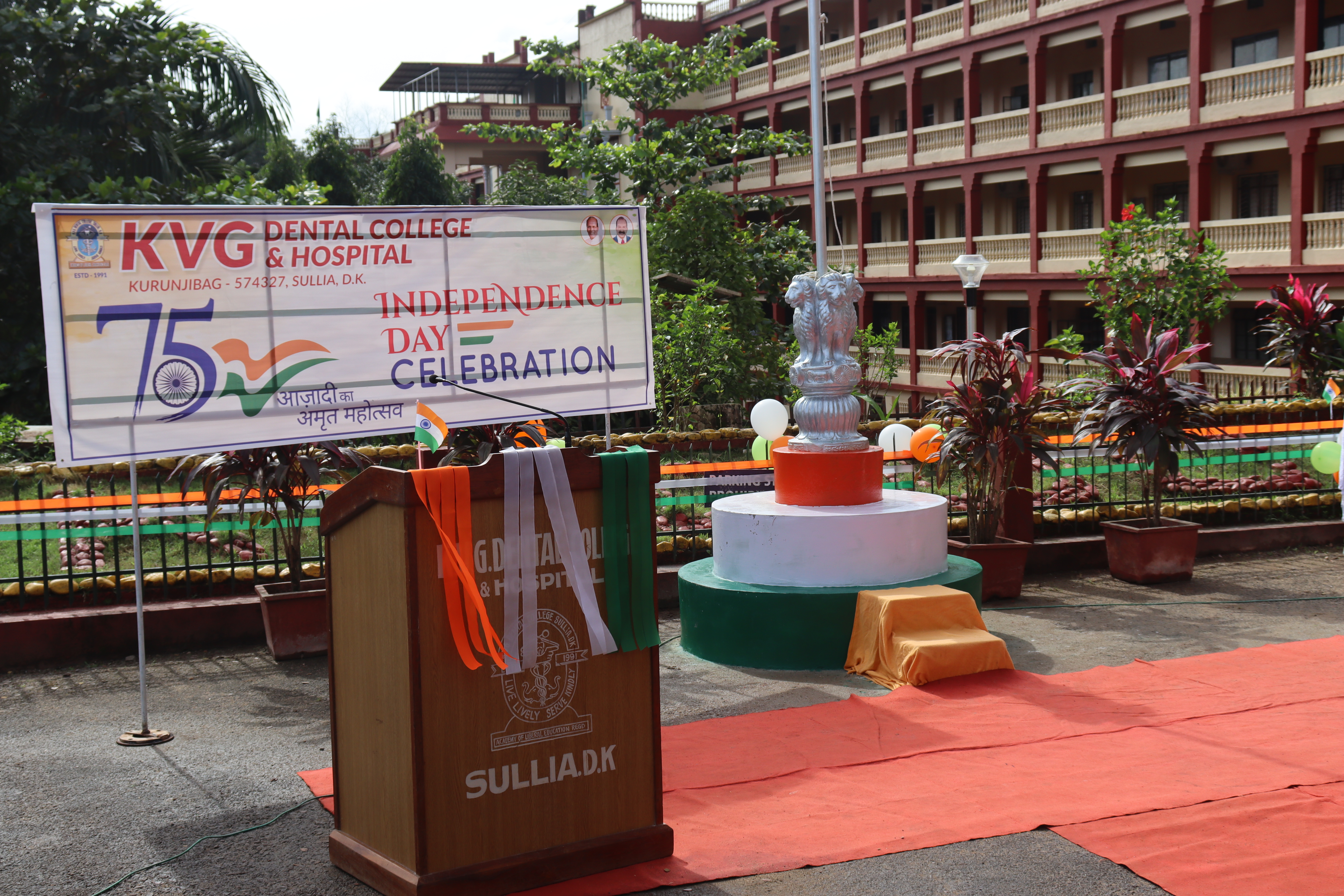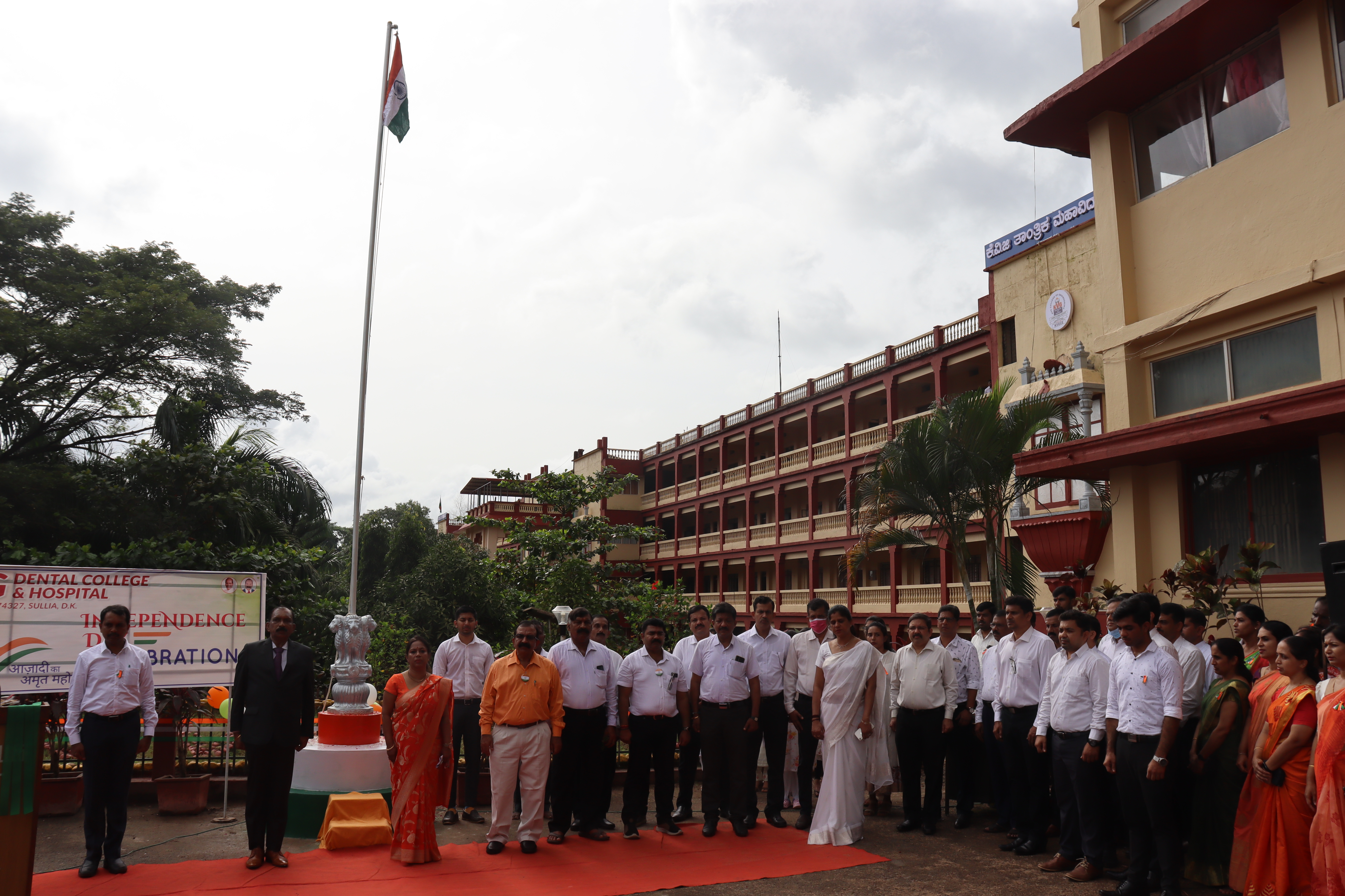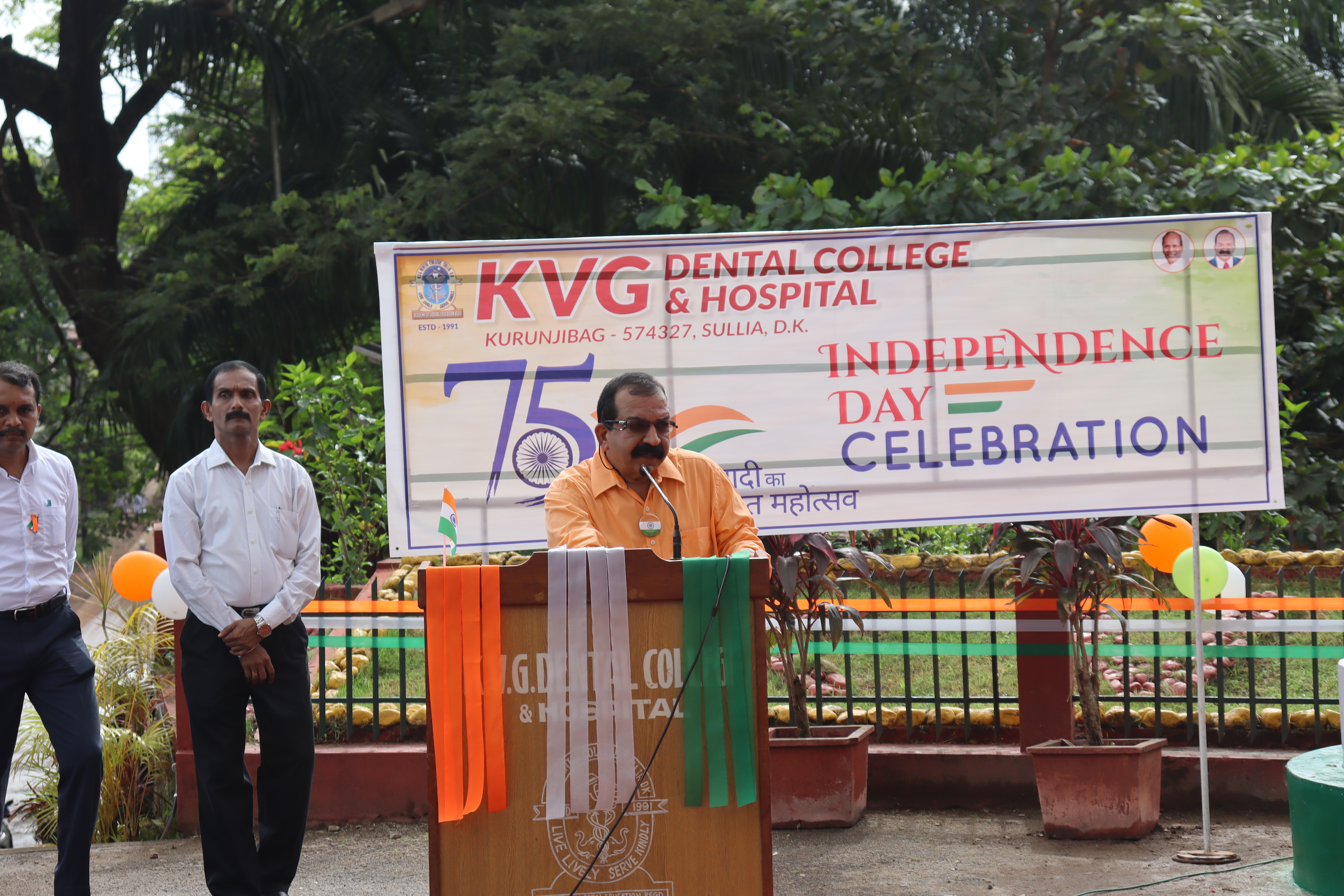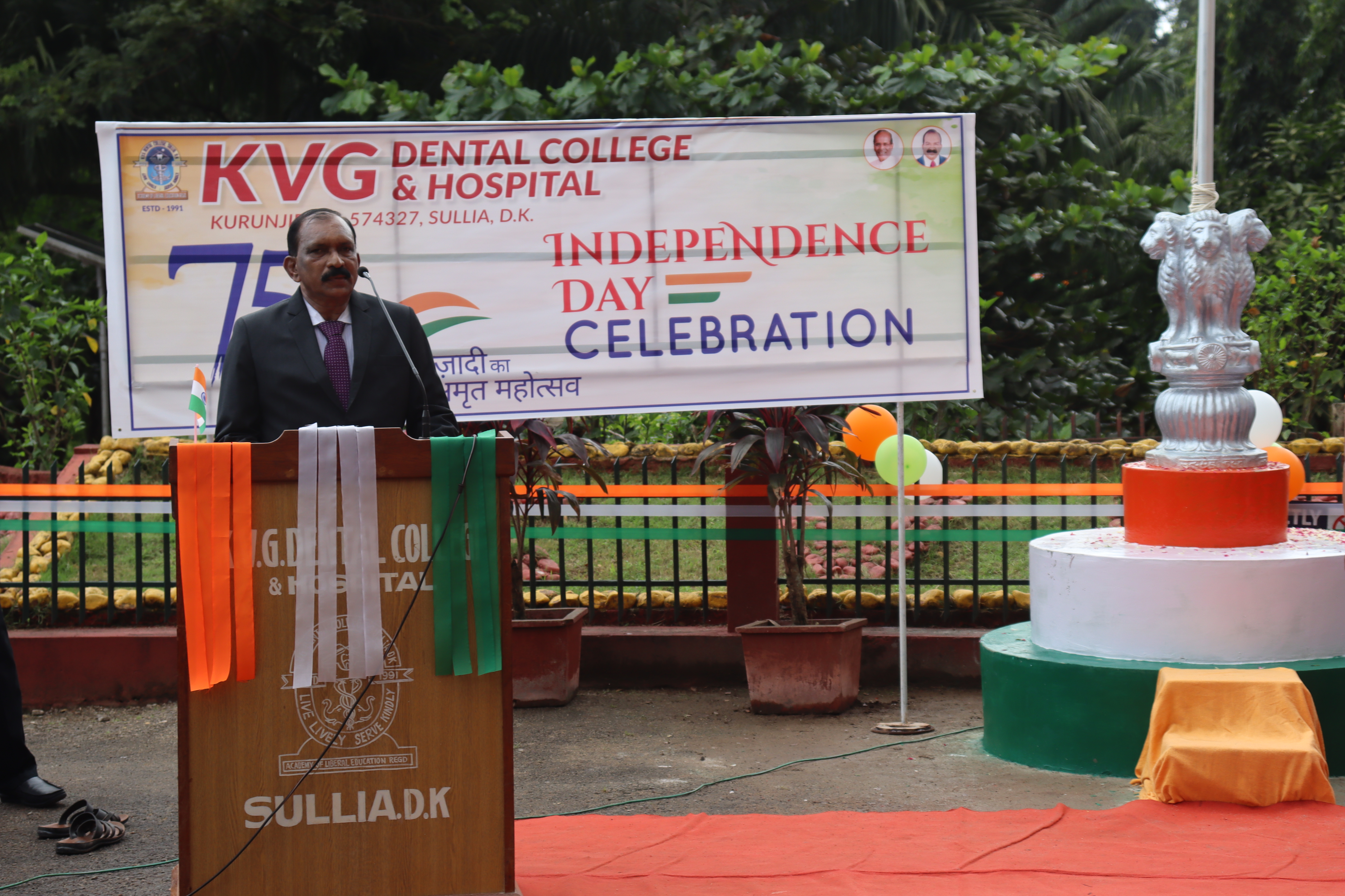 75 th independence day was celebrated in KVG Dental college & Hospital on August 15, 2022.Mr Ramadas Gowda superintendent of police/commandent Retd.[selection grade] hoisted the flag and gave inspiring speech.